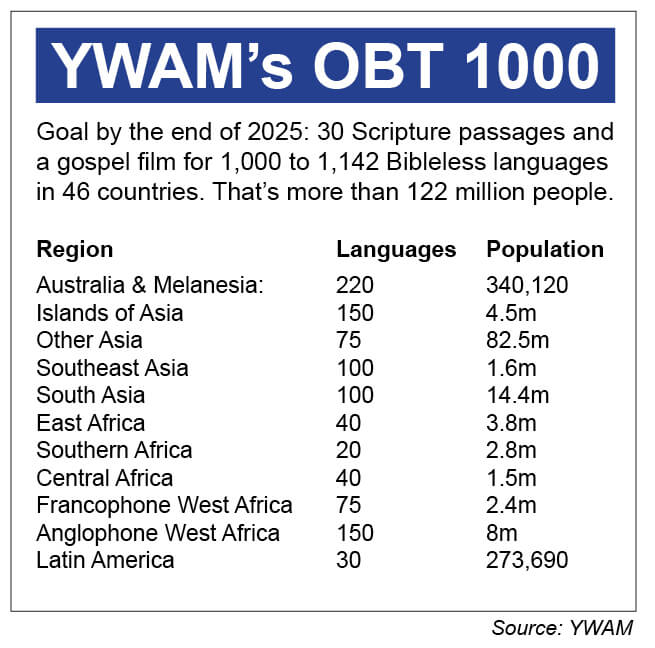 YWAM’s OBT (oral Bible translation) 1000 strategy is to mobilise 72 bases for training, including 33 hubs in strategic locations with a high concentration of Bibleless languages. They already have more than 50 commitments for bases, Youngshin says.