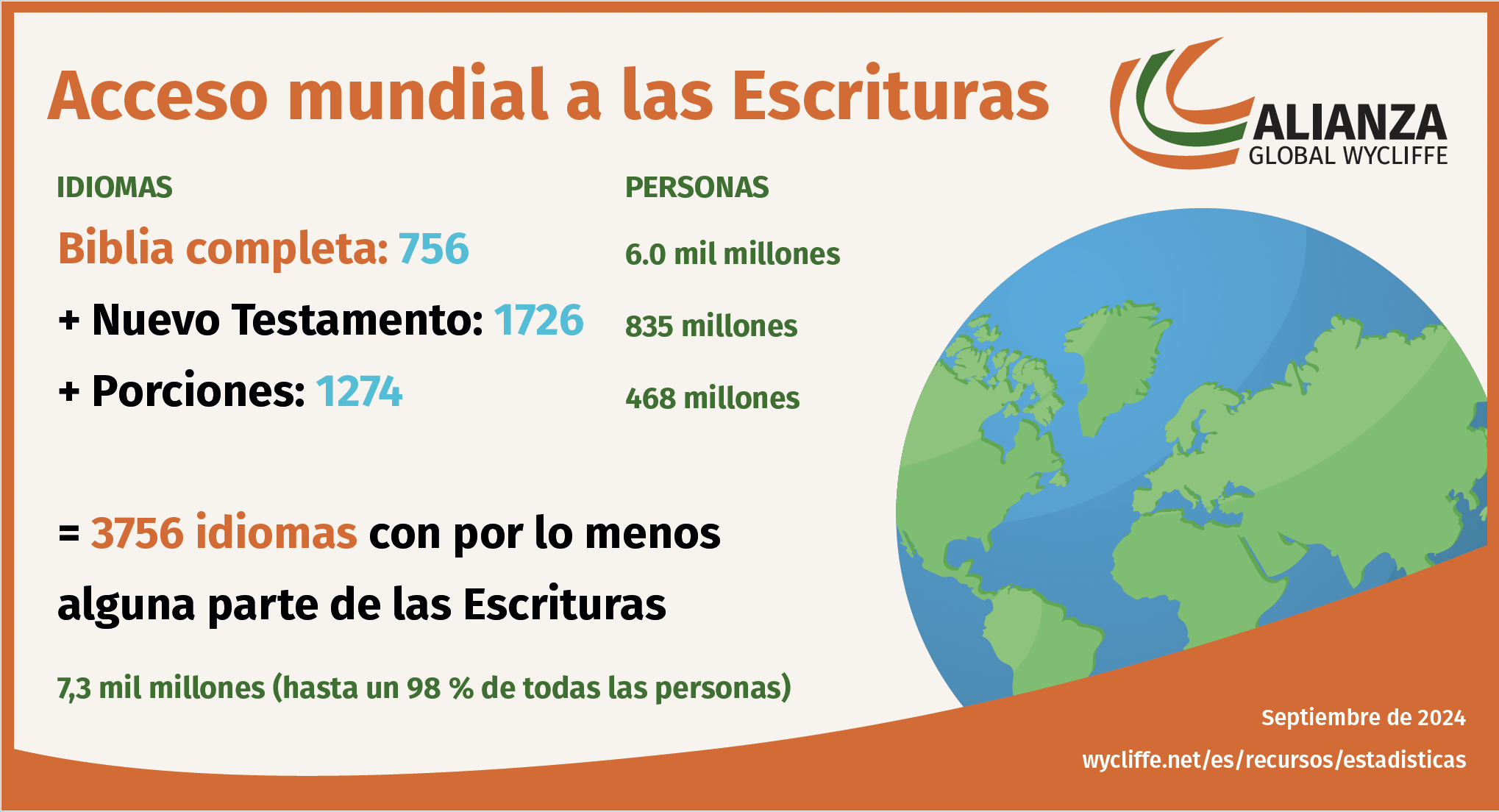 De acuerdo con ProgressBible, la entidad que registra las estadísticas de acceso mundial a las Escrituras, a 1 de septiembre, solo quedan 985 idiomas por iniciar. Estos representan apenas 29.3 millones de personas (menos del 1 % de la población mundial). Para comparar, eso es menor a la población de 33 millones de la segunda ciudad más grande del mundo: Delhi, India.